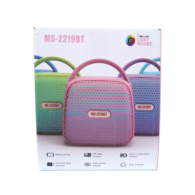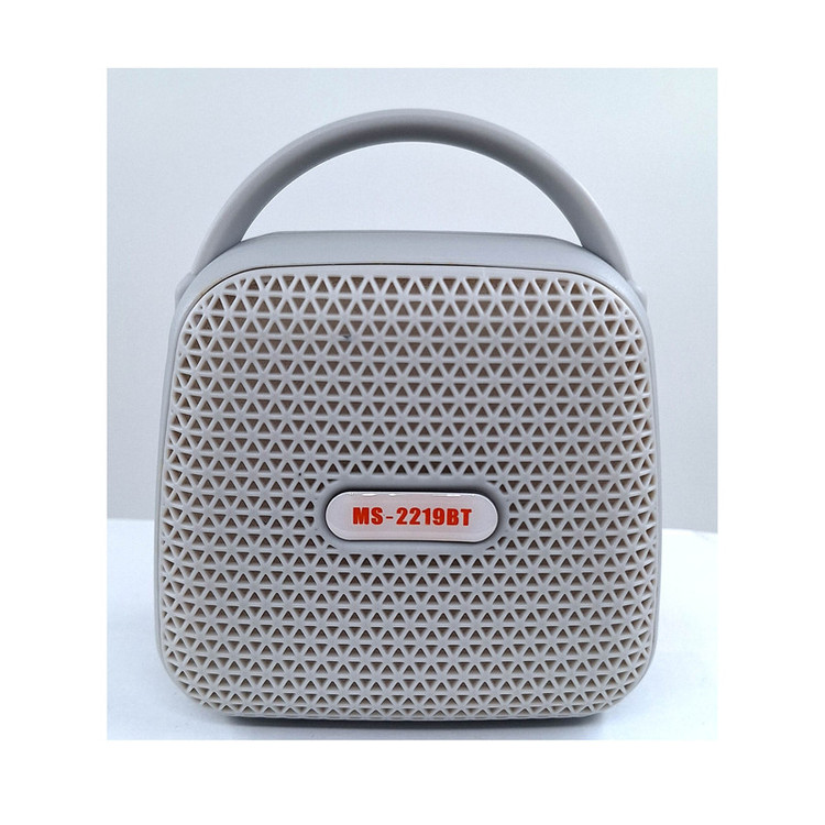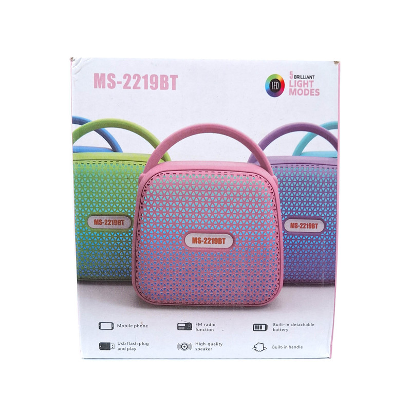 اسپیکر بلوتوثی قابل حمل مدل MS-2219BT با توجه به ابعاد و وزن مناسب خود میتواند در هر جایی لذت گوش دادن به موسیقی را برای کاربران فراهم کند. پورتهای اتصال این اسپیکر در قسمت پشتی آن قرار دارند و به هیچ عنوان زیبایی قسمت جلویی این محصول را دچار اختلال نمیکنند. کلیدهای کنترل موسیقی و صدا هم در قسمت بالا و پشت اسپیکر بلوتوثی MS-2219BT قرار دارند و دسترسی به آنها کار دشواری به نظر نمیرسد. درایو اصلی MS-2219BT قابلیت ارائه توان خروجی حداکثر 5 وات ارائه میکند تا بلندی و شفافیت صدای نسبتا مناسبی را هنگام گوش دادن به موسیقی از این اسپیکر شاهد باشیم. اتصالات اسپیکر به حافظه جانبی و دستگاهها توسط پورتهای USB،انجام میشود. امکان اتصال بدون سیم نیز توسط بلوتوث داخلی MS-2219BT وجود دارد و کاربران به سادگی میتوانند تلفن همراه، تبلت و دیگر دستگاههای بلوتوثی خود را به سادگی با این اسپیکر همگامسازی کنند. این اسپیکر دارای رادیو FM می باشد که از طریق کلید Mode می توانید از آن استفاده کنید. تامین انرژی این اسپیکر نیز برعهده باتری شارژی لیتیومی است که از شارژدهی مناسبی نسبت به بلندی صدا برخوردار است.سایز این اسپیکر 5 اینچ با ابعاد 13x11x7سانتی متر می باشد که آن را برای حمل ، آسان تر کرده است . این اسپیکر دارای دستگیره می باشد که میتوانید به راحتی آن را به کیف یا کوله ی خود آویز کنید. این اسپیکر در رنگ بندی متنوع تولید شده که میتواند تمامی سلیقه ها را به خود جلب کند .