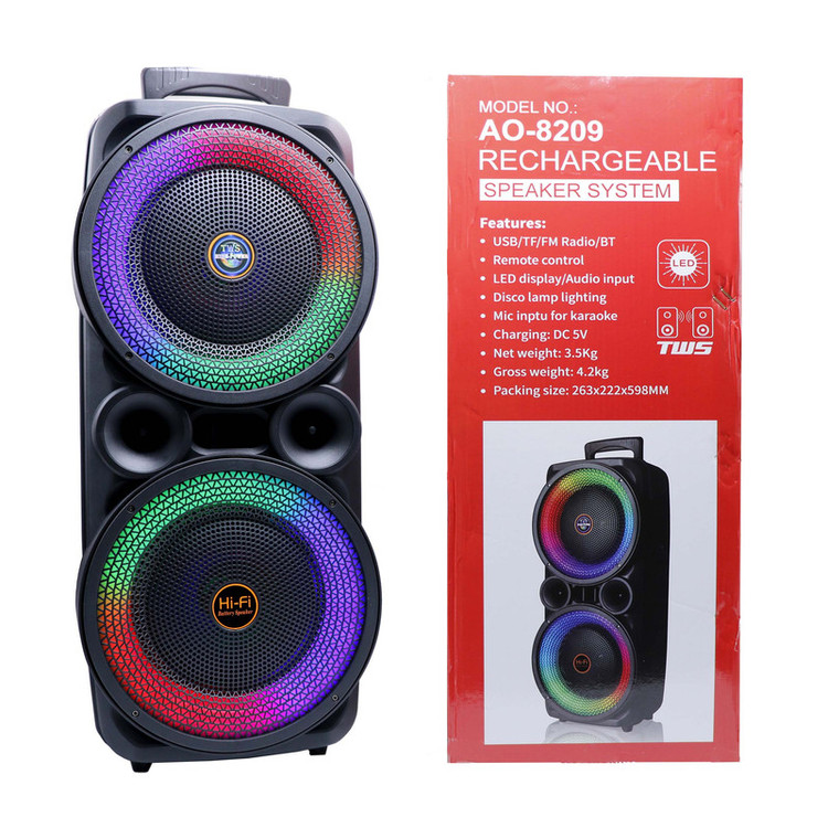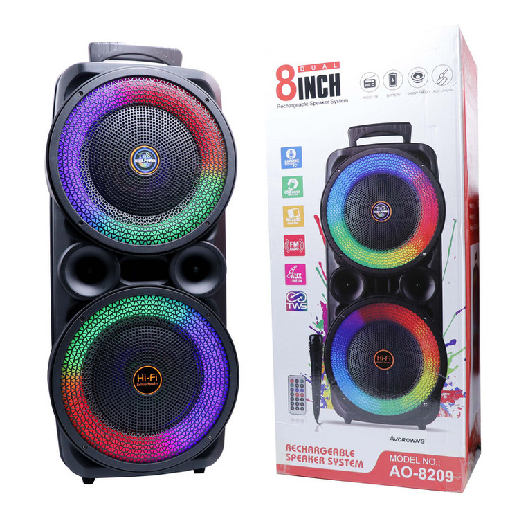 اسپیکر حرفه ای اوکراون مدل AO-8209 جدیدترین مدل از اسپیکرهای سری پارتی باکس PartyBox از کمپانی اوکراون می باشد.دو باند قدرتمند 8 اینچی حرفهای این اسپیکر صدای موسیقی را با بیس و وضوحبالا پخش میکنند . کانکشنهای پرکاربرد به شما امکان اتصال آسان به دو صورت بیسیم و باسیم را میدهند تا بتوانید با هر دستگاهی بهراحتی به این سیستم صوتی متصل شوید و موسیقی دلخواه خود را بشنوید. یکی از راه های اتصال به اسپیکر، بلوتوث می باشد کافی است بلوتوث موبایل یا تبلت خود را روشن کنید، اسپیکر را جستجو کرده و متصل شوید. میتوانید آهنگهای موردعلاقه خود را در یک فلش مموری یا مموری کارت ذخیره نموده و از طریق پورت USB یا (مموری کارت)TFبه اسپیکر متصل کرده و پخشکنید. همچنین میتوانید توسط کابل AUX دستگاه خود را از طریق ورودی 3.5 میلیمتری به اسپیکر متصل کنید. حالا فقط دکمه پخش را فشار داده و از شنیدن موسیقی موردعلاقه خود لذت ببرید.