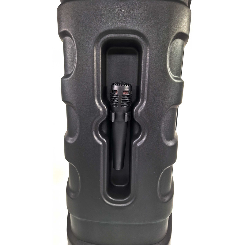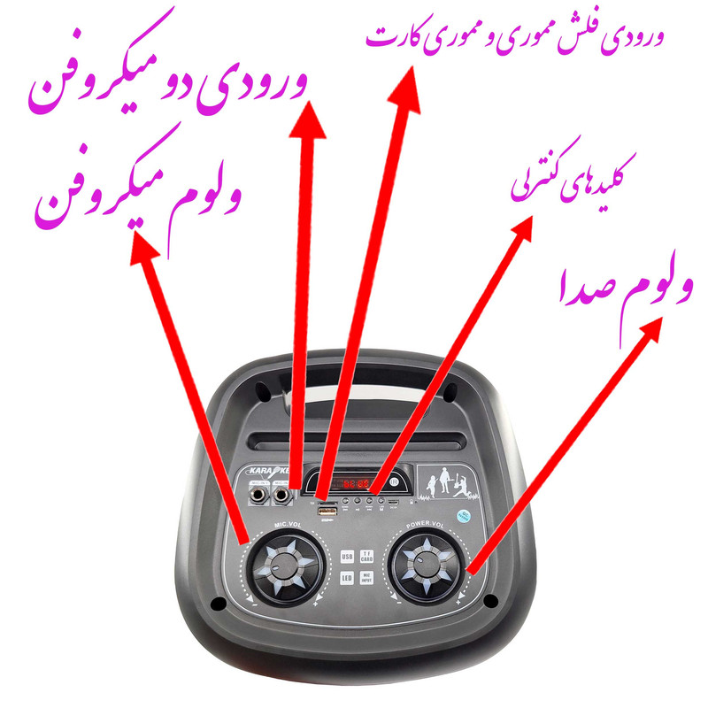 این اسپیکر دارای دو ورودی میکروفن و ولوم میکروفن به منظور تغییر میزان صدای میکروفن است.