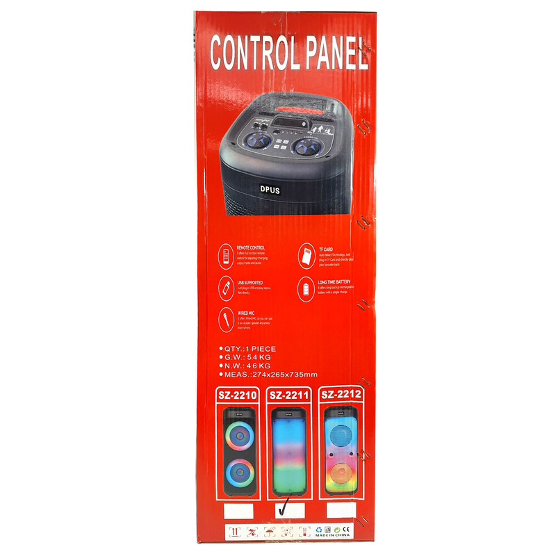 اسپیکر مدل SZ-2211 جدیدترین مدل از اسپیکرهای سری پارتی باکس می باشد.دو باند قدرتمند 8 اینچی حرفهای این اسپیکر صدای موسیقی را با بیس و وضوحبالا پخش میکنند . یکی از راه های اتصال به اسپیکر، بلوتوث می باشد کافی است بلوتوث موبایل یا تبلت خود را روشن کنید، اسپیکر را جستجو کرده و متصل شوید. نسخه بلوتوث این اسپیکر 5 میباشد. میتوانید آهنگهای موردعلاقه خود را در یک فلش مموری یا مموری کارت ذخیره نموده و از طریق پورت USB یا (مموری کارت)TFبه اسپیکر متصل کرده و پخشکنید. تکنولوژی TWS قابلیت اتصال دو اسپیکر به هم و پخش یکسان موسیقی را برای شما فراهم کرده است . به این صورت که دواسپیکر را از طریق بلوتوث به هم متصل نموده و سپس با گوشی یا تبلت از طریق بلوتوث موزیک را از هردو اسپیکر به صورت همزمان گوش دهید . توان خروجی اسمی این اسپیکر 20 وات می باشد که میتواند فضای بین 200 تا 250 متر را پوشش دهد . این اسپیکر دارای یک میکروفن سیم دار میباشد که برای قرارگرفتن آن روی اسپیکر، محلی تعبیه گردیده است. این اسپیکر دارای رقص نورمیباشد که زیبایی خاصی را به این اسپیکر بخشیده است همچنین میتوانید به راحتی آن را خاموش یا روشن کنید . ریموت کنترل این اسپیکر امکاناتی همچون تغییر اکولایزر ، تغییرMode ، تغییر میزان صدا ، تغییر موزیک و... را به شما میدهد. شارژ این اسپیکر از طریق MicroUSB با شارژرهای اندروید امکان پذیراست . ارتفاع این اسپیکر 71 سانتی متر و وزن آن 4.6 کیلوگرم می باشد. این اسپیکر دارای باتری لیتیومی داخلی به ظرفیت 4000 میلی آمپر و مدت زمان پخش این اسپیکر بستگی به میزان ولوم دستگاه بین 3 تا 4 ساعت می باشد و زمان نیاز برای شارژ کامل آن 5 الی 8 ساعت (بسته به شارژر) است و پس از شارژ کامل چراغ شارژ آن خاموش میشود. به گفته ی شرکت سازنده این اسپیکر قابلیت اکوی میکروفن از طریق کلیدهای روی پنل را نیز دارد . این اسپیکر دارای رادیو FM نیز میباشد که به راحتی با فشردن کلید Mode میتوانید روی رادیو سوییچ کرده و با زدن کلید پلی به جستجوی شبکه های رادیویی بپردازید .