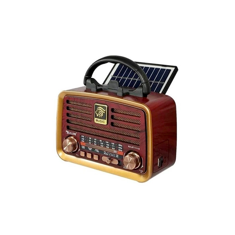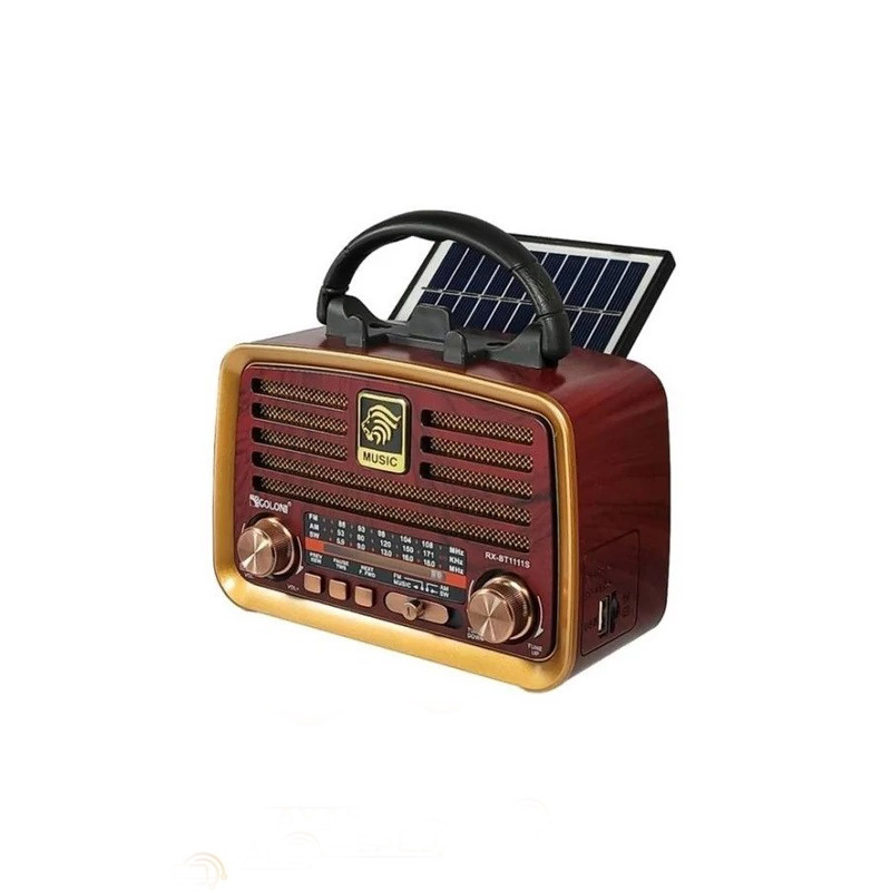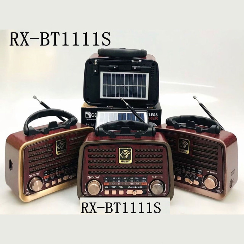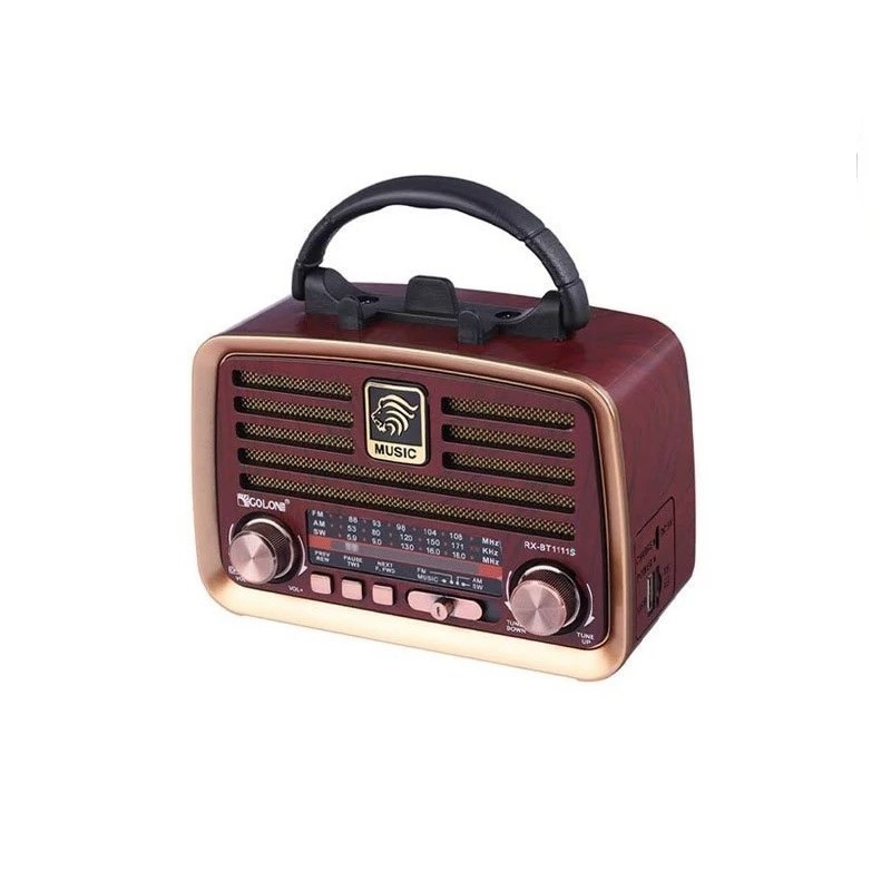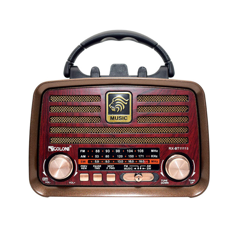 با رویکار آمدن شبکه های مجازی و اینترنت همچنان رادیو طرفداران پرو پا قرص خود را دارد . این دستگاه با طراحی کلاسیک به شکل رادیوهای قدیمی اما با کارکردی امروزی میباشد که توانایی پخش فایل های صوتی با فرمت MP3 را از طریق درگاه های ورودی USB و پورت کارت حافظه SDدارد. رادیوی گولون مدل RX-BT1111S علاوه بر امکان استفاده از برق شهری ، با داشتن باتری داخلی قابل شارژ و امکان استفاده از 2 باتری معمولی مدل UM-1 در همه جا میتواند همراه خوبی برای شما باشد . با داشتن 3 موج رادیو دیگر نگران از دست دادن برنامه رادیویی مورد علاقه خود نباشید. با خرید این محصول کاربردی شما تنها صاحب یک رادیو نگردیده اید بلکه صاحب یک پلیر قوی هم شده اید .با داشتن آنتن تلسکوپی بر روی دستگاه به راحتی میتوانید در هر مکانی به ایستگاه رادیویی دلخواه خود متصل و از شنیدن رادیو لذت ببرید . این رادیو باداشتن 3 درگاه ورودی شاملUSB و فلش در سایز SD و همچنین اتصال از طریق بلوتوث میتواند یک پلیر کاربردی با صدای عالی برای شما باشد . از دیگر امکانات این دستگاه میتوان به بلندگوی با کیفیت استریو اشاره نمود . همراه این رادیو یک عدد باتری 18650 شارژی ، یک عدد کابل برق 2 شیاره که در درب پشتی رادیو قرار داده شده است. این رادیو دارای پنل خورشیدی جهت شارژ باتری می باشد .